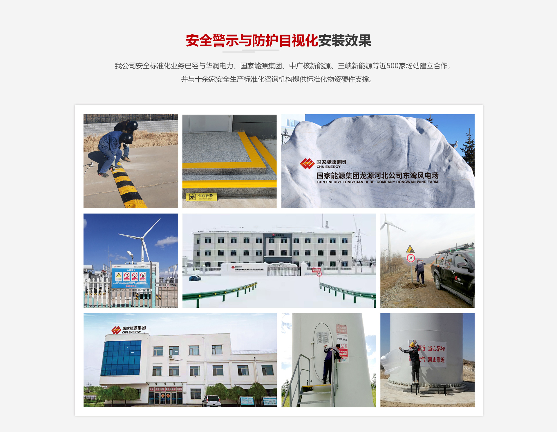我公司安全標準化業務已經與國家能源集團、中廣核新能源、三峽新能源等近500家場站建立合作,并與十余家安全生產標準化咨詢機構提供標準化物資硬件支撐。