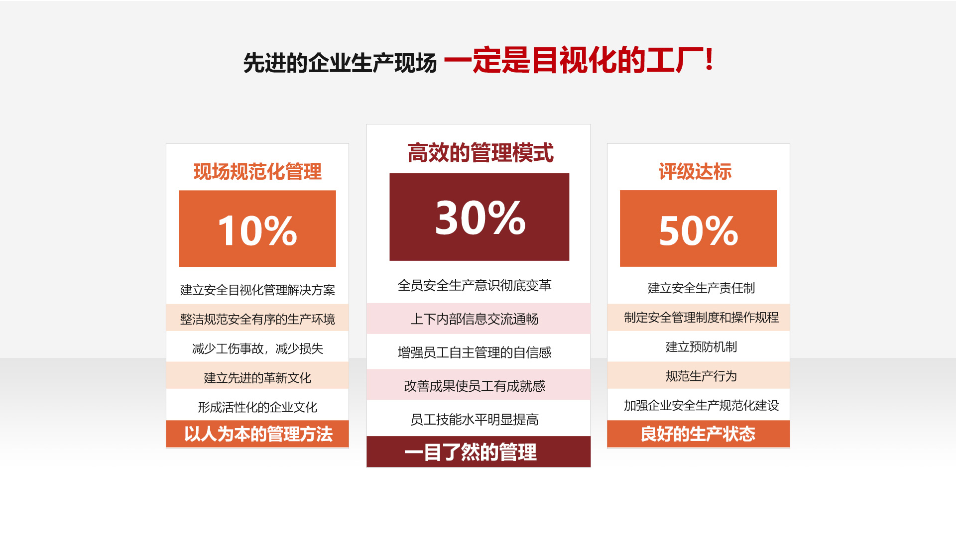 華泰安全目視化管理以安全法律、法規、標準和危害識別風險評價為基礎,運用標識警示、6S管理、看板管理、定置管理等方法,結合企業VI、生產的特點、安全管理現狀,將各方內容融合,策劃一套系統的安全目視化管理解決方案。