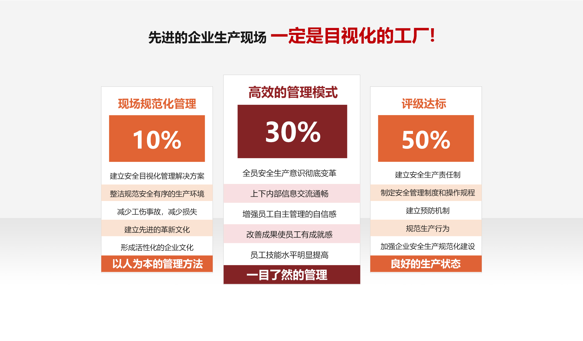 華泰安全目視化管理以安全法律、法規(guī)、標(biāo)準(zhǔn)和危害識別風(fēng)險(xiǎn)評價(jià)為基礎(chǔ),運(yùn)用標(biāo)識警示、6S管理、看板管理、定置管理等方法,結(jié)合企業(yè)VI、生產(chǎn)的特點(diǎn)、安全管理現(xiàn)狀,將各方內(nèi)容融合,策劃一套系統(tǒng)的安全目視化管理解決方案。
